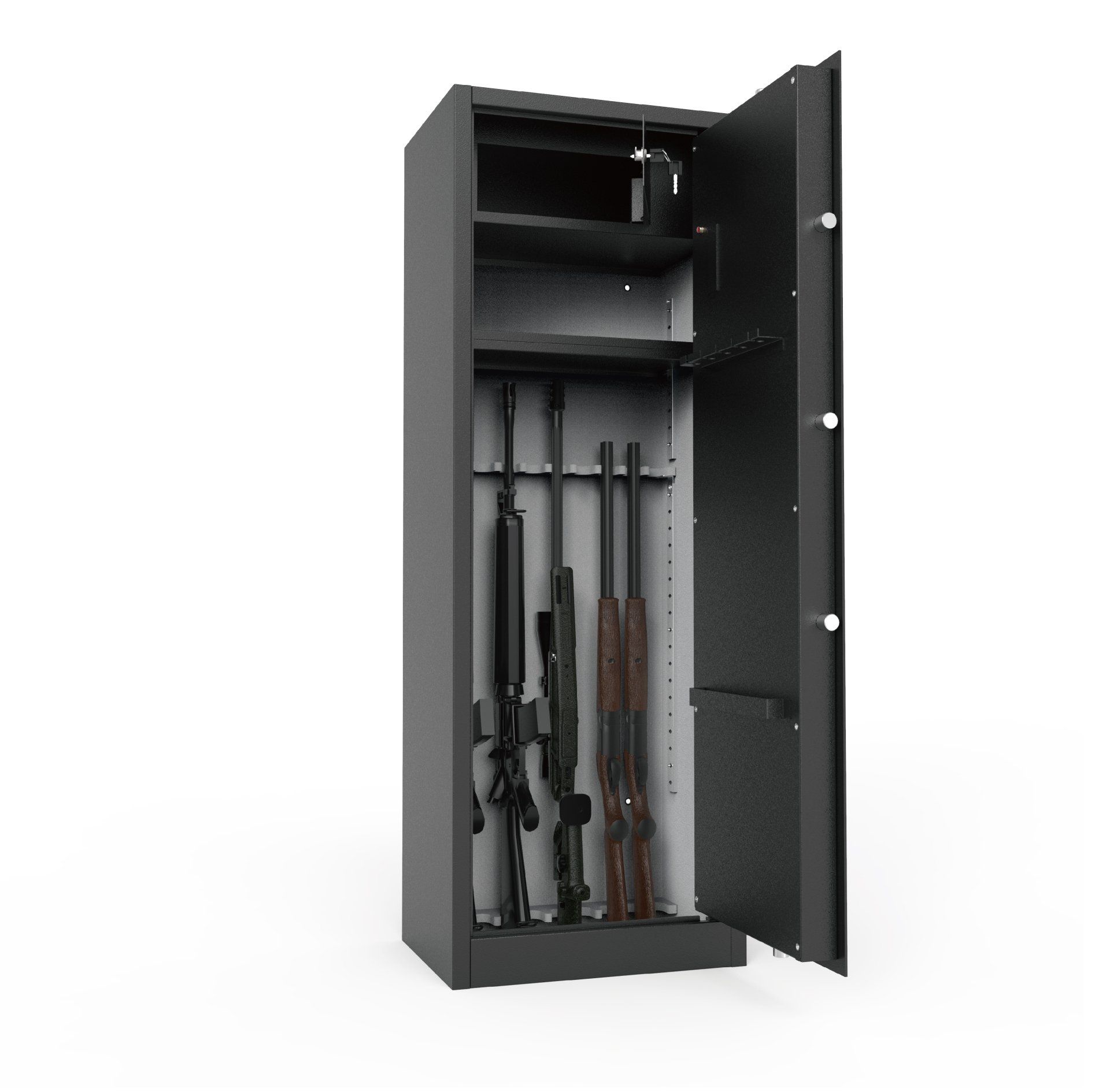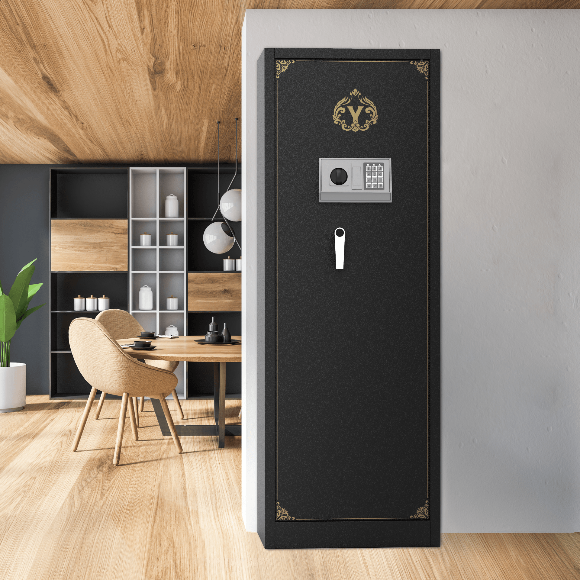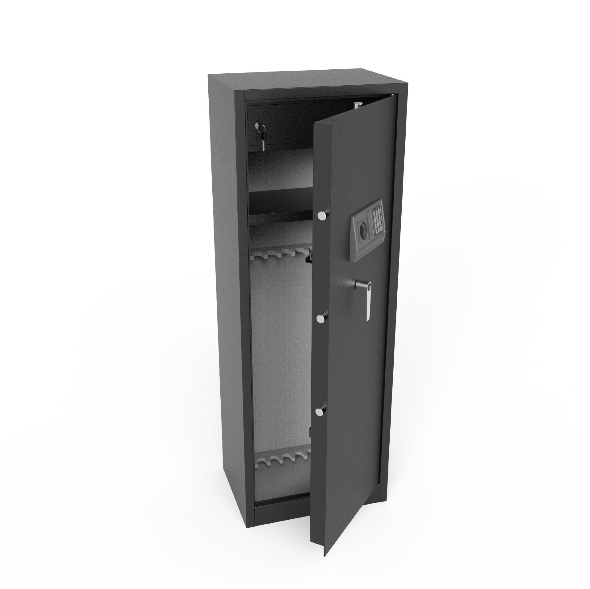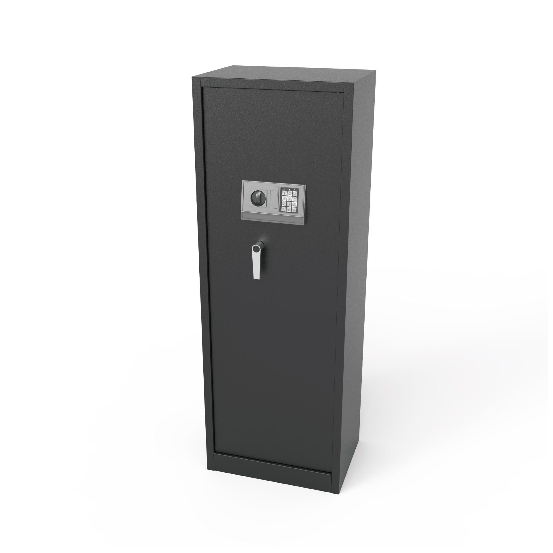 Compliant with both category A and B firearm regulations, this Steel Gun Safe from Yicall stores up to 8 guns. It includes a separate, completely lockable ammo box, floor carpet, and floor mounting bolts for additional security.