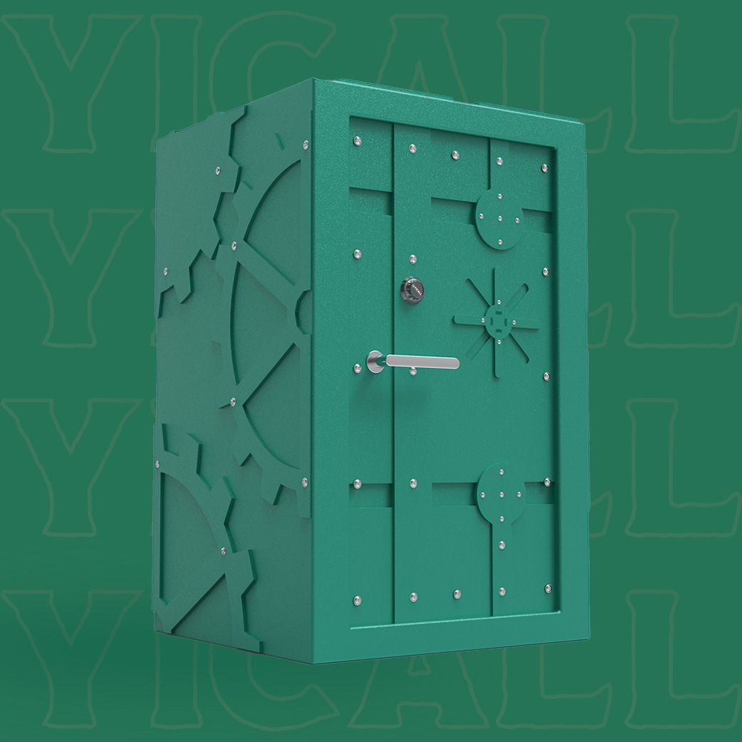 This safe is stylized with different shapes and sizes of metal to create a very detailed look.